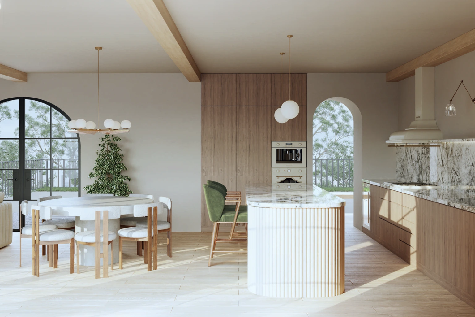 Grandes ventanales y porches sombreados crean una relación natural entre la casa y su entorno. Las transiciones son suaves: del interior al jardín, de la sombra al sol, del silencio al paisaje.